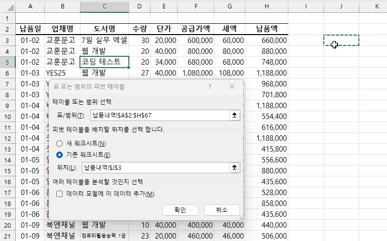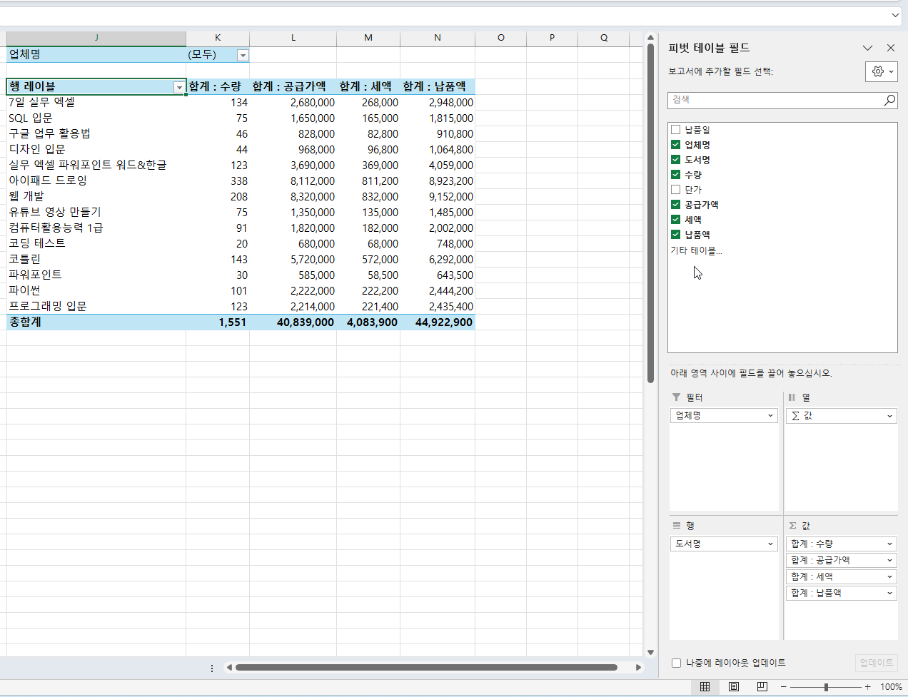 텍스트 형식인 도서명은 행 영역에 숫자 형식인 수량, 공급가액, 세액, 납품액 필드는 값 영역에 자동으로 추가됩니다.