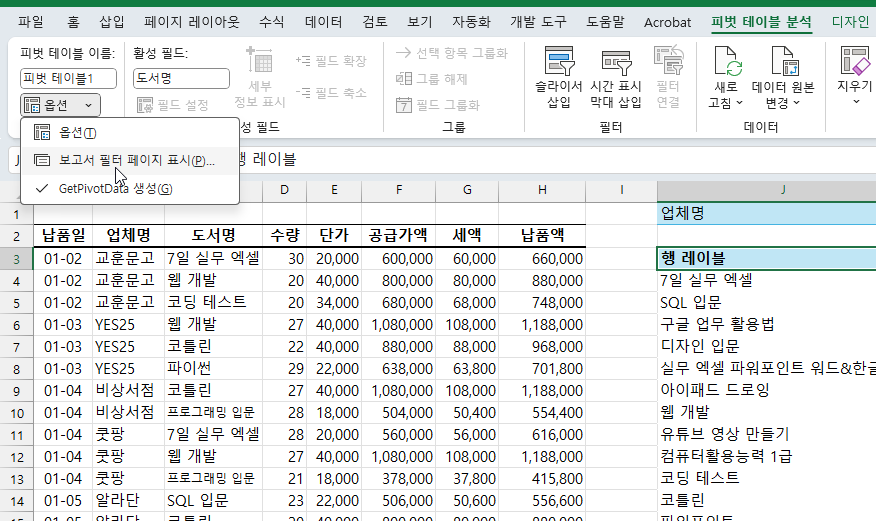 5. [피벗 테이블 분석] 탭 - [옵션] - [보고서 필터 페이지 표시]를 선택합니다.