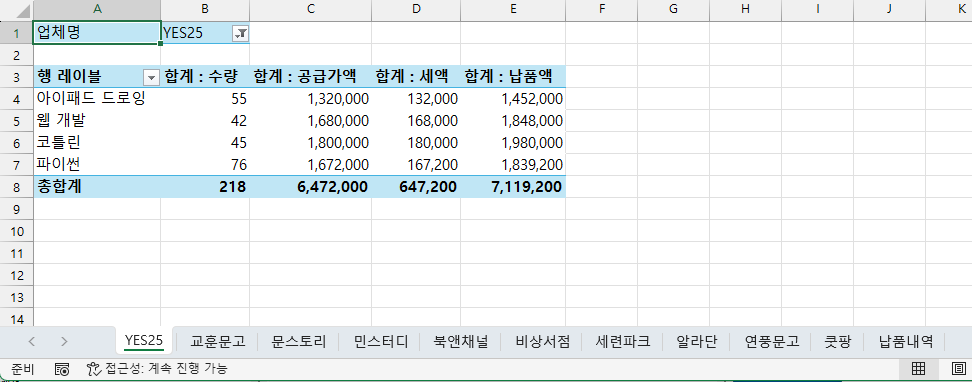 순식간에 업체명 시트가 생성이 되고 각 시트에는 업체명에 맞게 필터 된 피벗 테이블 보고서가 작성되어 있습니다.
