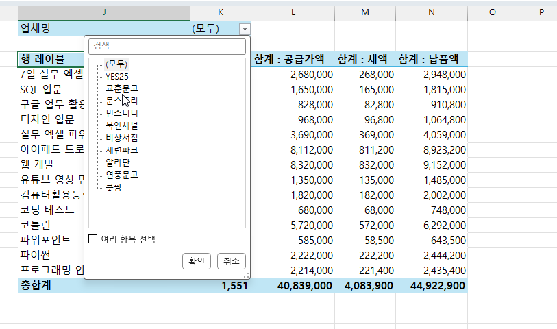 필터 영역에서 업체명을 선택하면 해당 업체명에 맞는 결과로 피벗 테이블이 표시되지만 우리가 작성하려는 것은 업체별 납품 내역을 각 시트로 나눠 작성하는 것입니다.
