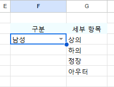 예시를 먼저 보겠습니다. 의류 구매 내역에서 여성복을 선택하면 상의, 하의, 원피스, 아우터가 표시되고