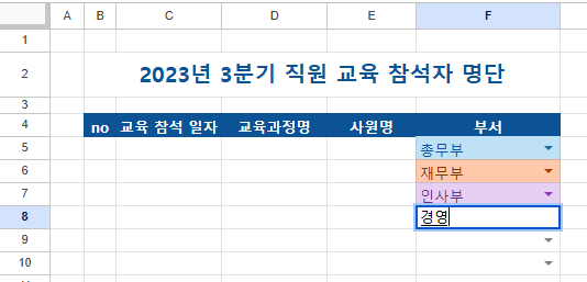 3분기 직원 교육 참석자 명단에서 부서명을 직접 입력하지 않고 드롭다운에서 선택하도록 설정해 보겠습니다. 그럼 잘못된 부서명이 입력되는 것을 방지할 수 있습니다.
