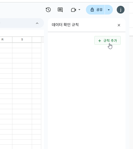[데이터] - [데이터 확인]을 선택합니다. 화면 오른쪽에 [데이터 확인 규칙] 창이 실행되면 [규칙 추가]를 누릅니다.