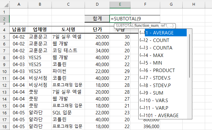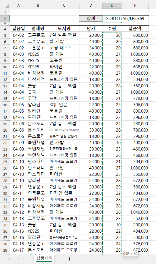 실시간으로 업체별 납품액 합계를 확인할 일이 잦다면 사용 중인 데이터에 SUBTOTAL 함수를 활용하면 됩니다.