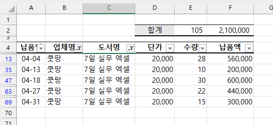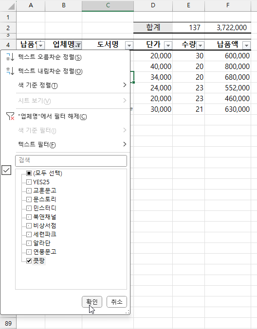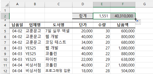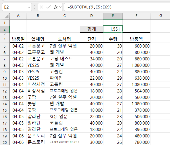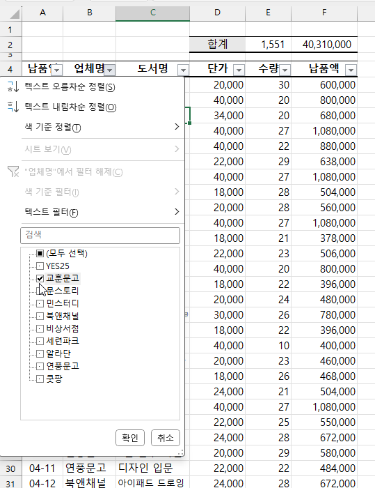 덕분에 빠르게 교훈문고의 납품액 합계를 확인할 수 있죠.