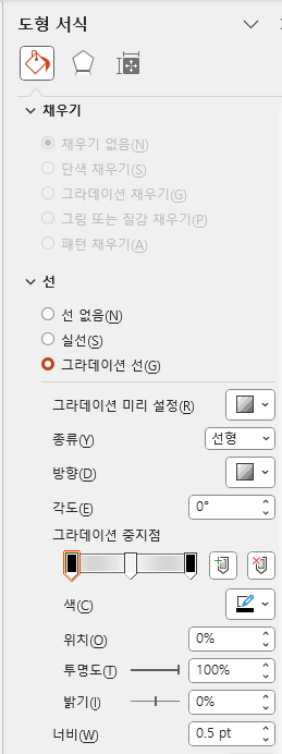 2. [채우기] - [선] - [그라데이션 선]을 선택