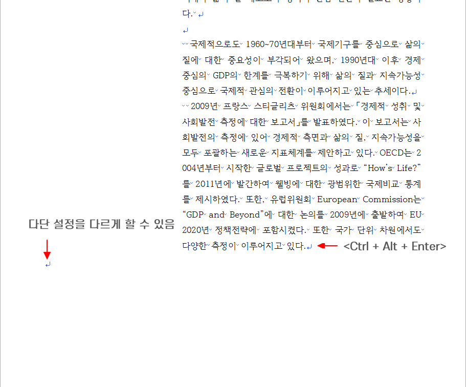 첫 번째 쪽과 다르게 두 번째 쪽부터 단 설정을 다르게 하려면 문단 끝에서 <Ctrl + Alt + Enter>를 눌러 다단 설정 나누기를 합니다.