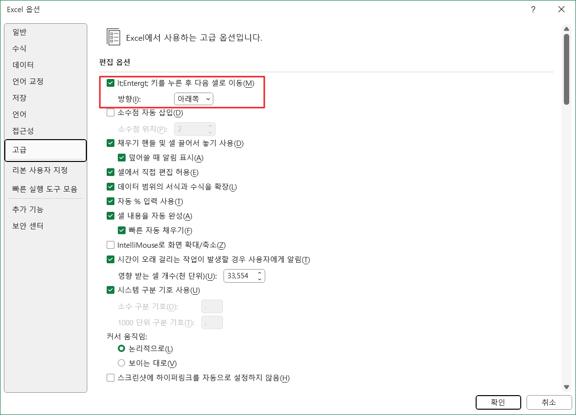 <Enter>는 행 이동, <Tab>은 열 이동으로 설정되어 있는데, 반대로 <Tab>으로 행 이동, <Enter>로 열 이동되도록 설정할 수 있습니다.