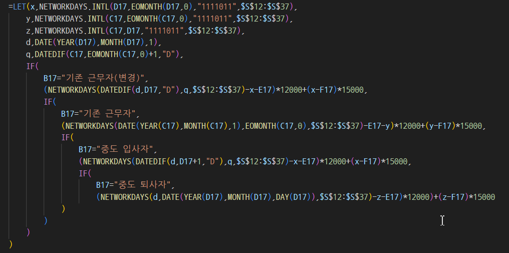 =LET(x,NETWORKDAYS.INTL(D17,EOMONTH(D17,0),"1111011",$S$12:$S$37),y,NETWORKDAYS.INTL(C17,EOMONTH(C17,0),"1111011",$S$12:$S$37),z,NETWORKDAYS.INTL(C17,D17,"1111011",$S$12:$S$37),d,DATE(YEAR(D17),MONTH(D17),1),q,DATEDIF(C17,EOMONTH(C17,0)+1,"D"),IF(B17="기존 근무자(변경)",(NETWORKDAYS(DATEDIF(d,D17,"D"),q,$S$12:$S$37)-x-E17)*12000+(x-F17)*15000,IF(B17="기존 근무자",(NETWORKDAYS(DATE(YEAR(C17),MONTH(C17),1),EOMONTH(C17,0),$S$12:$S$37)-E17-y)*12000+(y-F17)*15000,IF(B17="중도 입사자",(NETWORKDAYS(DATEDIF(d,D17+1,"D"),q,$S$12:$S$37)-x-E17)*12000+(x-F17)*15000,IF(B17="중도 퇴사자",(NETWORKDAYS(d,DATE(YEAR(D17),MONTH(D17),DAY(D17)),$S$12:$S$37)-z-E17)*12000)+(z-F17)*15000))))