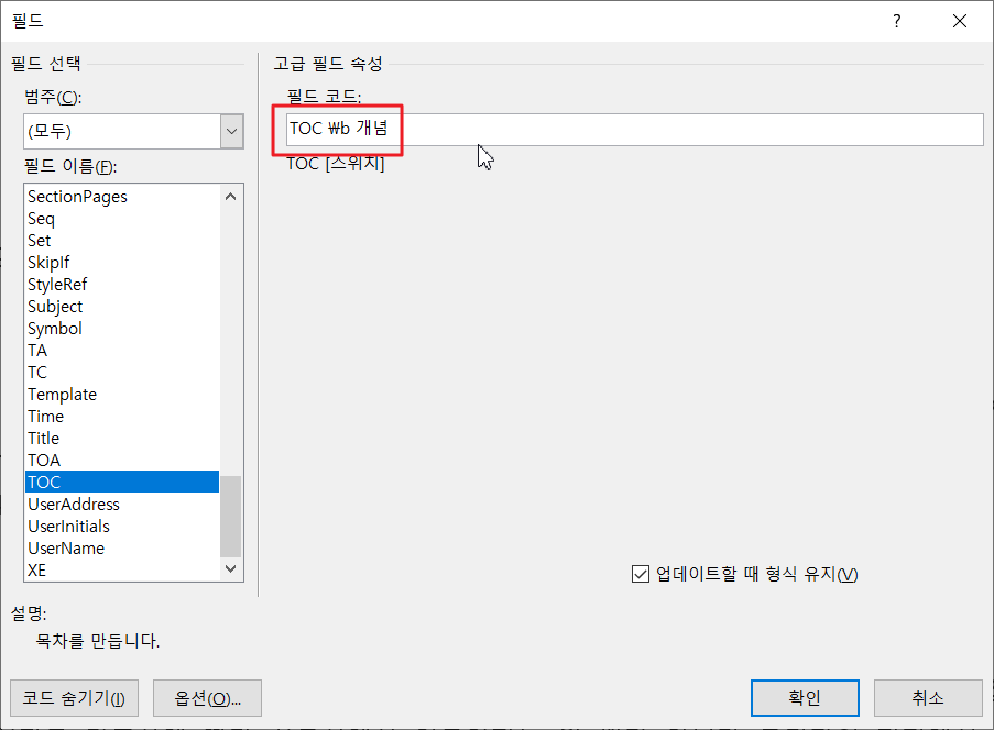 필드 이름 중 TOC를 선택하고, 아래의 [필드 코드]를 누릅니다.