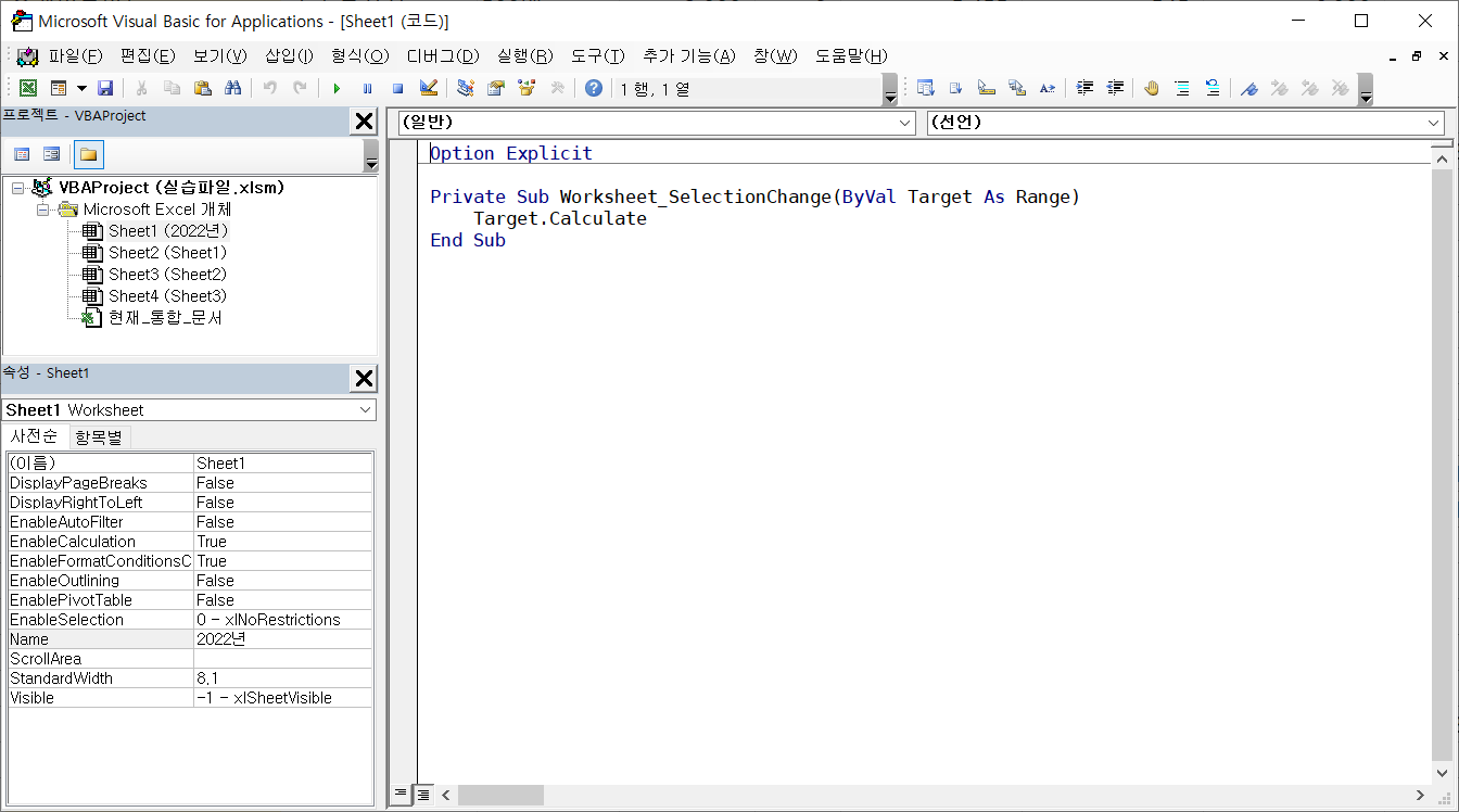 왼쪽 프로젝트 탐색기에서 현재_통합_문서를 더블클릭해서 코드 창에 나타내고 Workbook 개체 SheetSelectionChange 이벤트를 선택해서 붙여넣기 합니다.