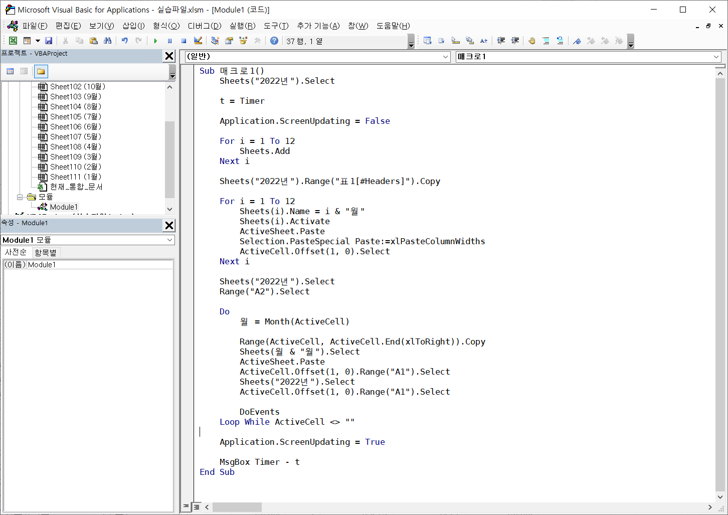 데이터가 많지 않은데 실행시간이 너무 오래 걸려 화면 업데이팅 속성(ScreenUpdating)을 해제해서 실행 속도를 향상시켰고, 도대체 얼마나 시간이 걸리는지, 그리고 언제 작업이 끝나는지 시각적으로 보이기 위해 타이머를 이용해 걸린 시간을 계산해서 MsgBox에 나타내는 코드도 있습니다.