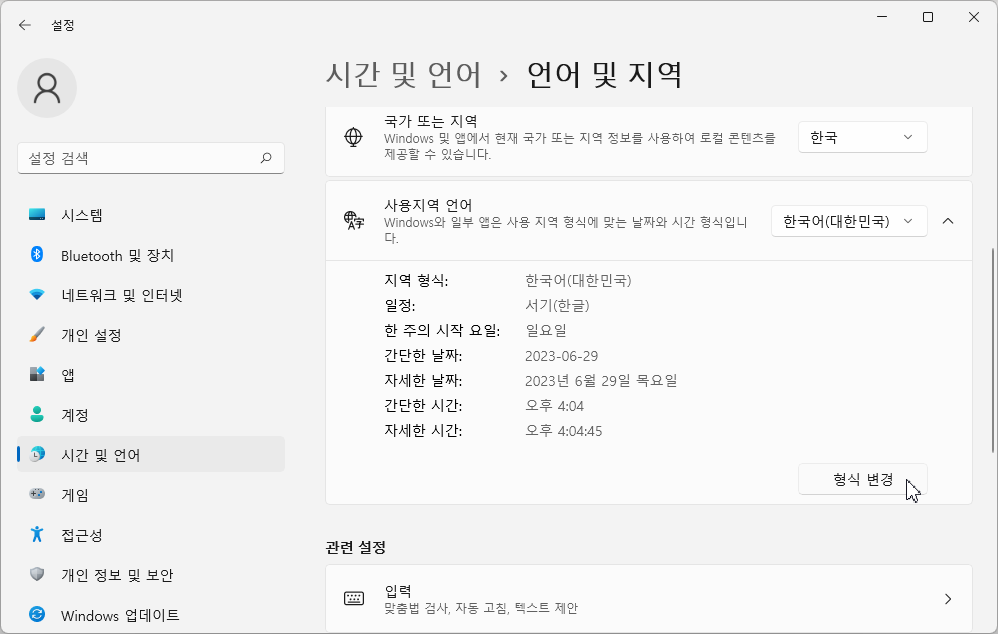 [지역]을 선택하고 '관련 설정' 중 [추가 날짜, 시간 및 국가별 설정]을 선택합니다.