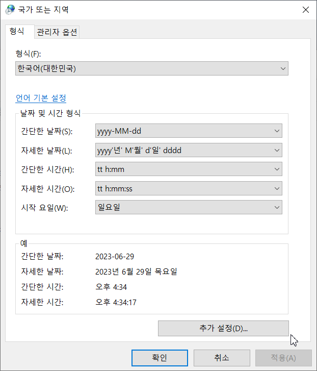 [국가 또는 지역] 대화상자에서 [형식] 탭을 선택하고 아래 [추가 설정]을 선택합니다.