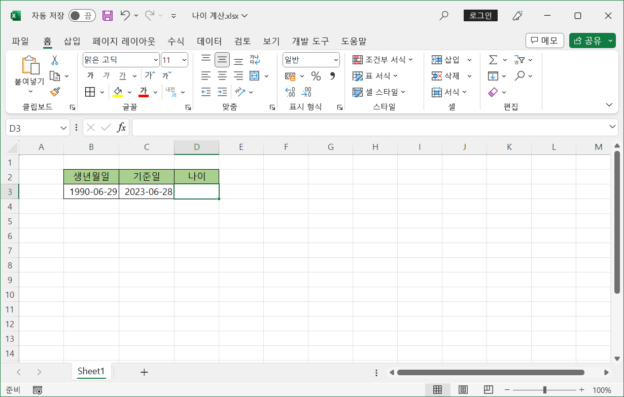 [B3] 셀에 생년월일, [C3] 셀에 기준일이 있습니다.