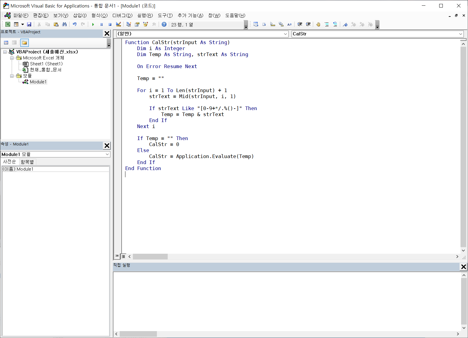 셀 내용에서 계산에 필요한 숫자와 연산자만 걸러서 수식을 완성하고 결과를 반환하는 사용자 정의 함수 CalStr 입니다.