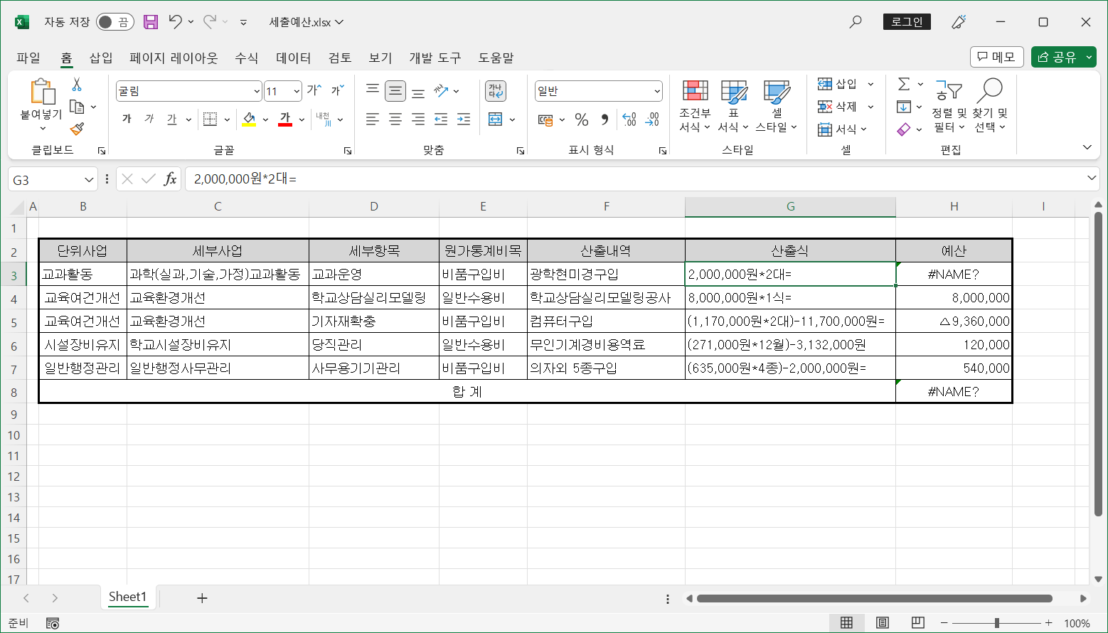 수식을 수정하거나 산출식 셀의 내용을 바꾸면 사용자 정의 함수 CalStr을 이해할 수 없기 때문에 #NAME? 오류 메시지가 표시됩니다.