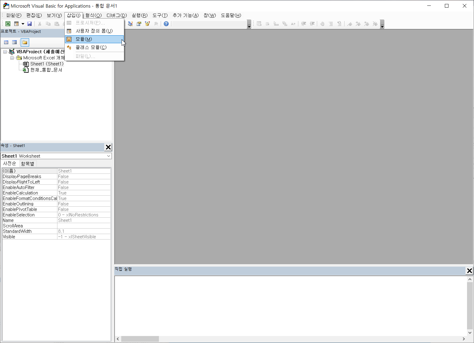 [삽입]-[모듈]을 선택하거나 <Alt, I, M>을 눌러 모듈을 추가합니다.