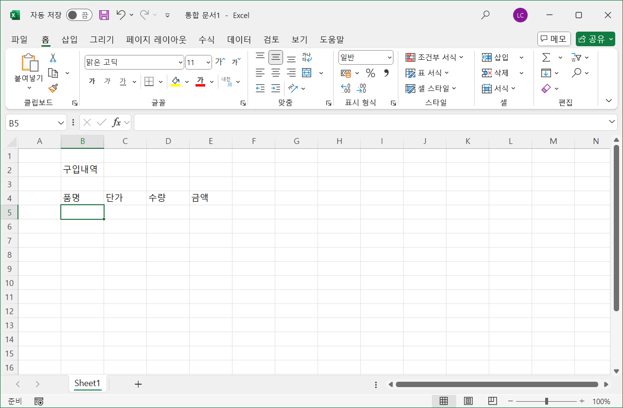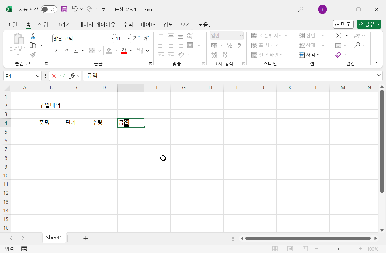 [B4] 셀에 '품명'을 입력하고 <Tab>를 눌러 [C4] 셀로 이동해 '단가'를 입력하고 같은 방법으로 [D4] 셀에 '수량', [E4] 셀에 '금액'을 입력한 상태입니다.