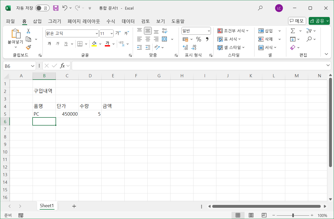 [B5] 셀부터 데이터를 입력하는데, E열은 수식을 작성할 것이라서 [D5] 셀에서 <Enter>를 누르면 다음 행의 데이터를 입력할 첫 열인 [B6] 셀로 커서가 이동합니다.