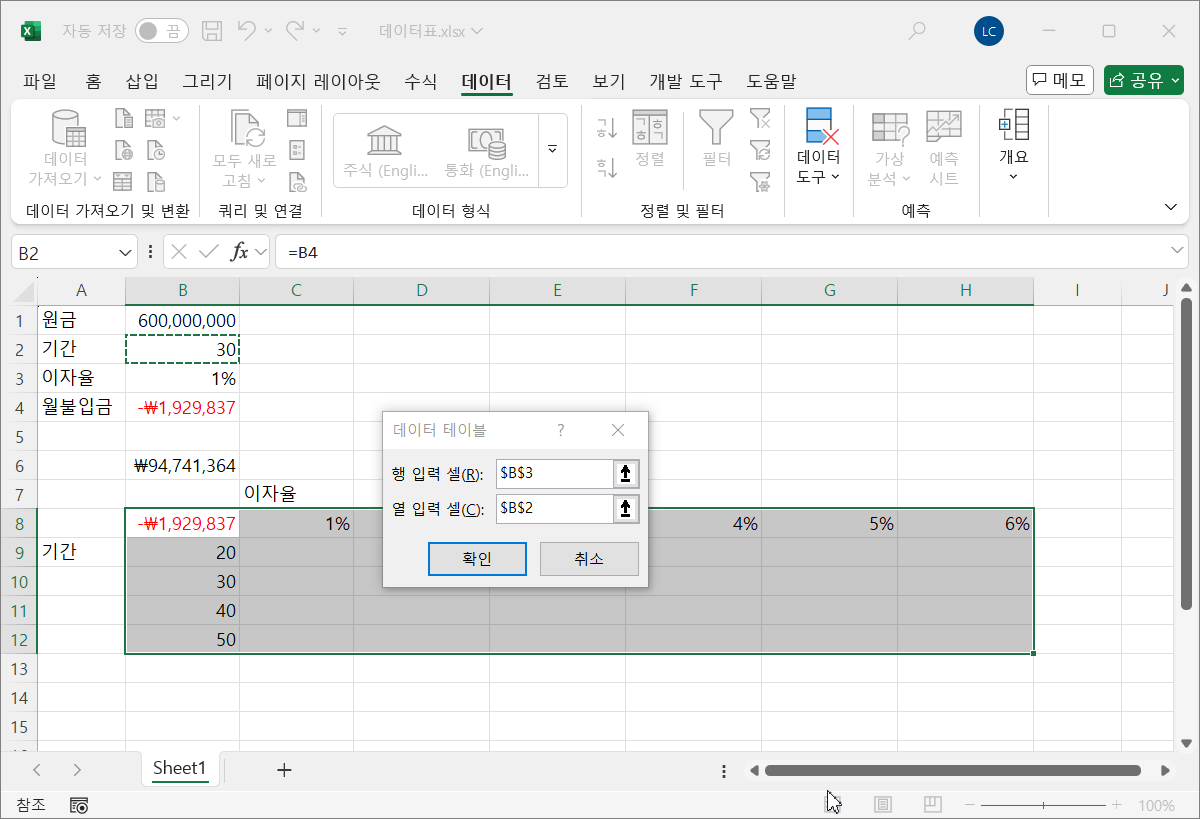 행 입력 셀 항목에는 이자율이 입력된 [B3] 셀을 선택해 넣고, 열 입력 셀 항목에는 상환 기간이 입력된 [B2] 셀을 선택해 넣습니다.