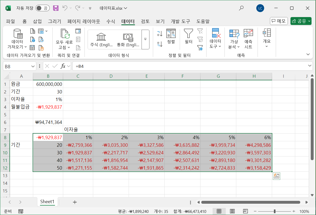[B8:H12] 셀 범위를 선택하고, [데이터]-[예측]-[가상 분석]-[데이터 표]를 선택합니다.