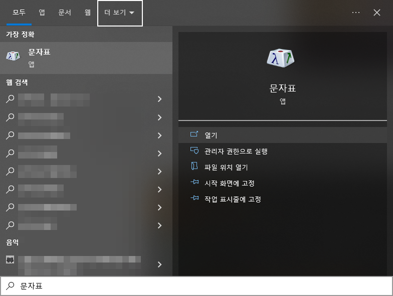 <윈도+S>를 눌러 찾기에서 문자표 실행합니다.
