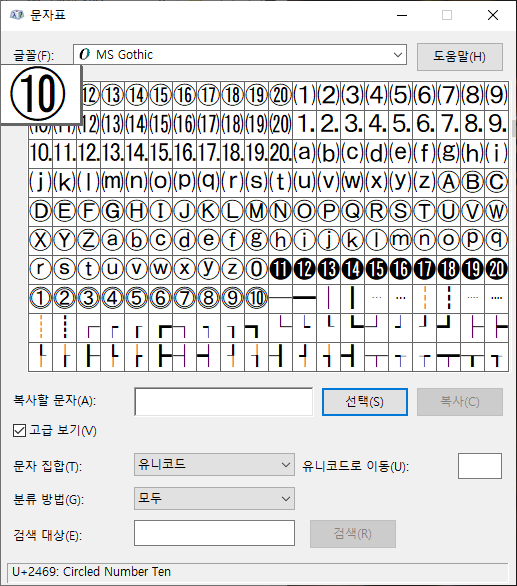 글꼴 항목에서 MS Gothic을 선택하고, 하위 집합 항목에서 괄호 영숫자를 선택합니다.