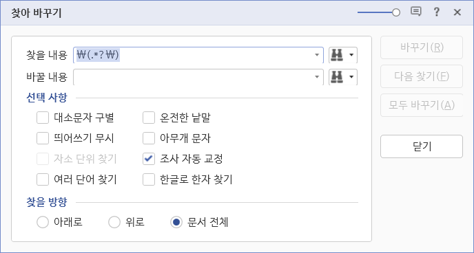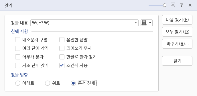 선택 사항에서 '조건식 사용'을 체크하고, 찾을 방향에서 '문서 전체'를 선택합니다.