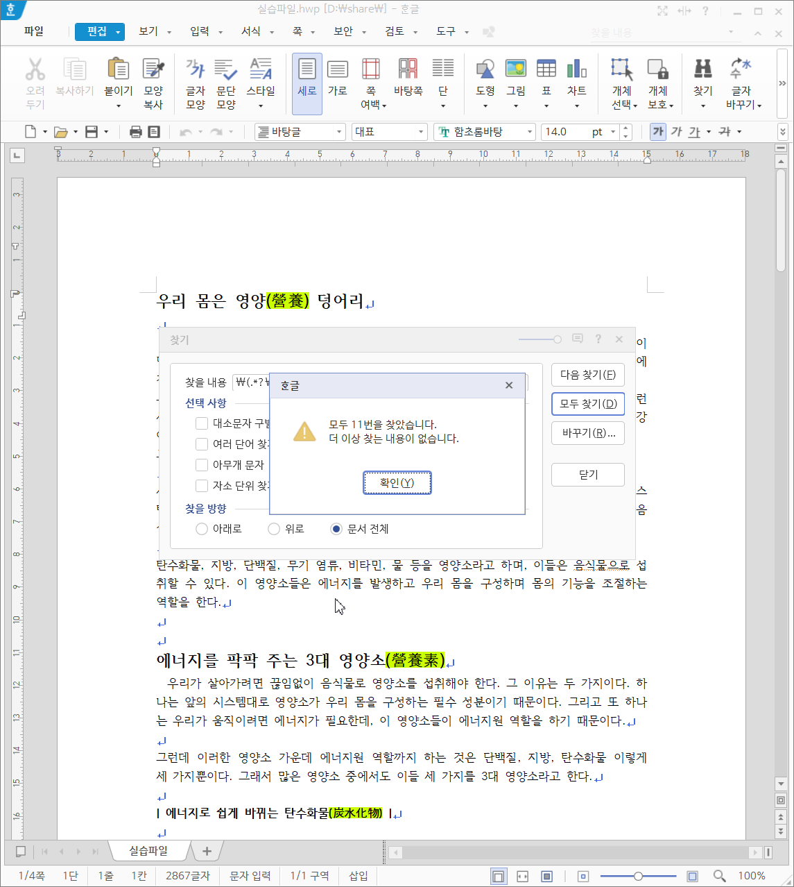 괄호가 많지 않다면 직접 찾아서 수정해도 되지만, 문서 분량이 많고 바꿔야할 내용도 아주 많은 경우에 일일이 수정하기 보다는 기능을 이용해 빠르고 정확하게 작업하는 것이 좋습니다.