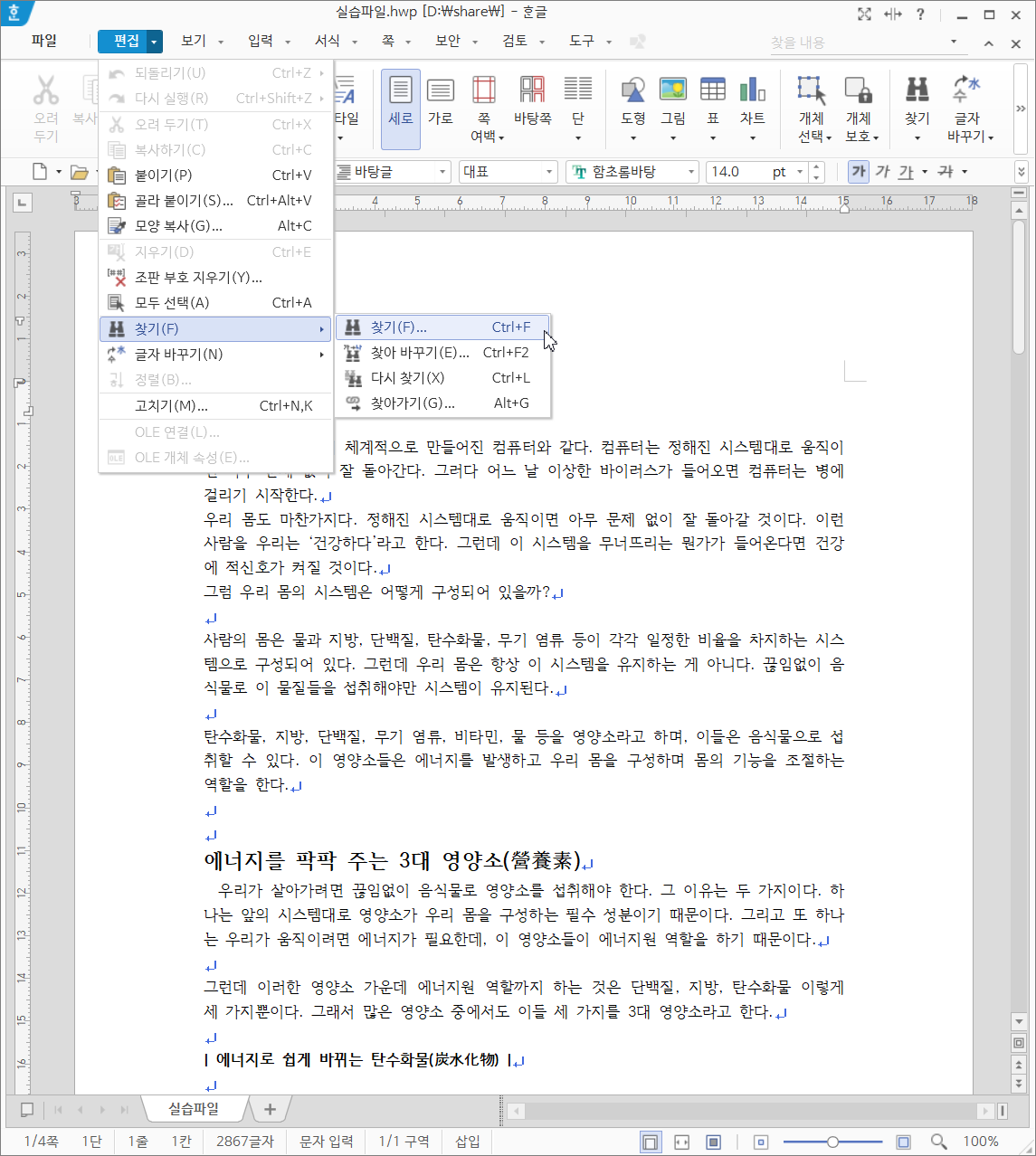 그럼 [편집] - [찾기] - [찾기]를 선택하거나 단축키 <Ctrl + F>를 누릅니다.