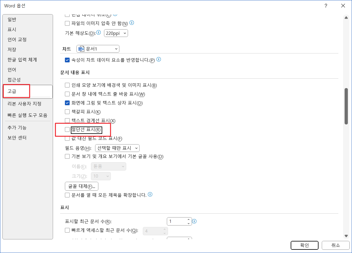 [파일]-[옵션]-[고급]-[절단선 표시]