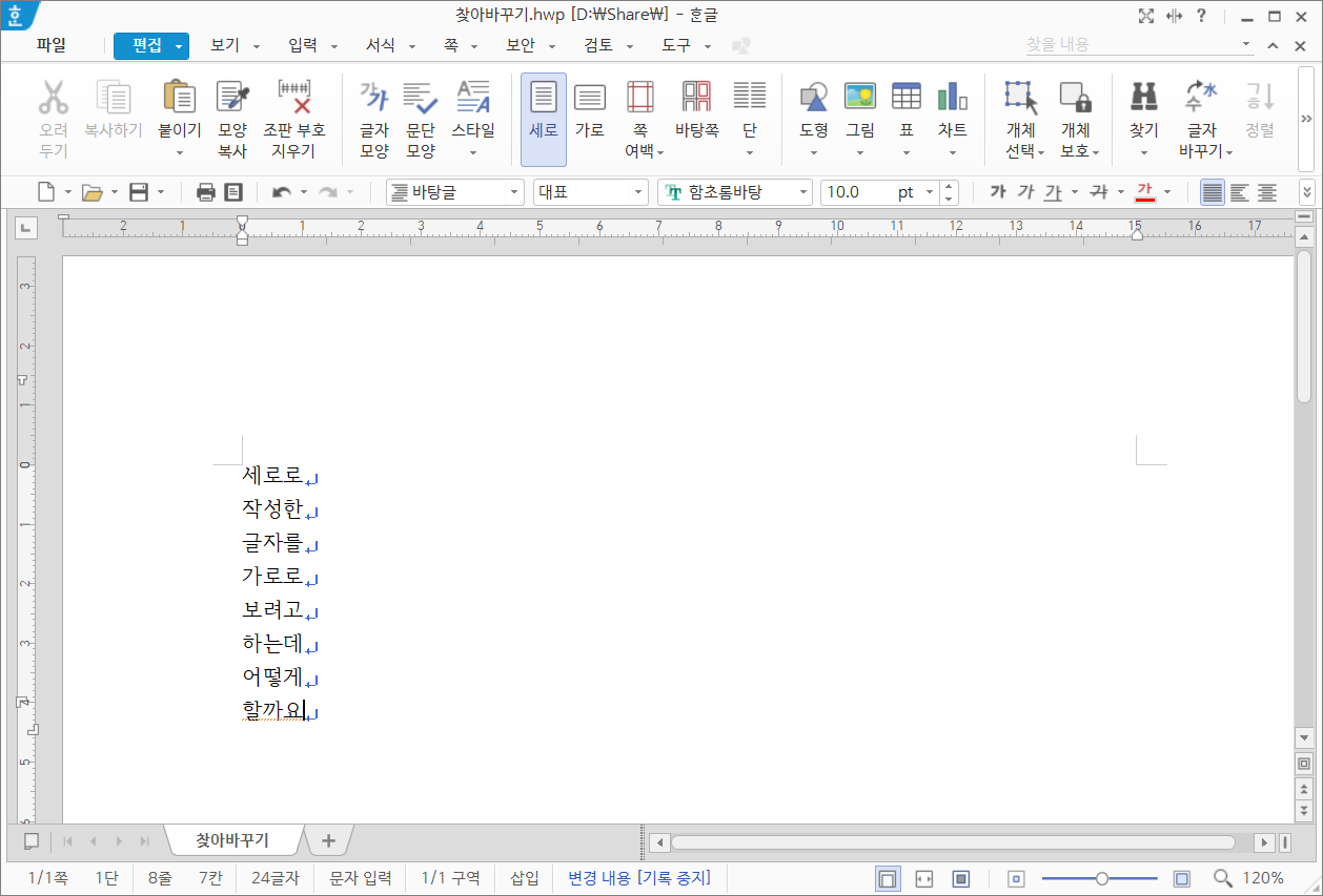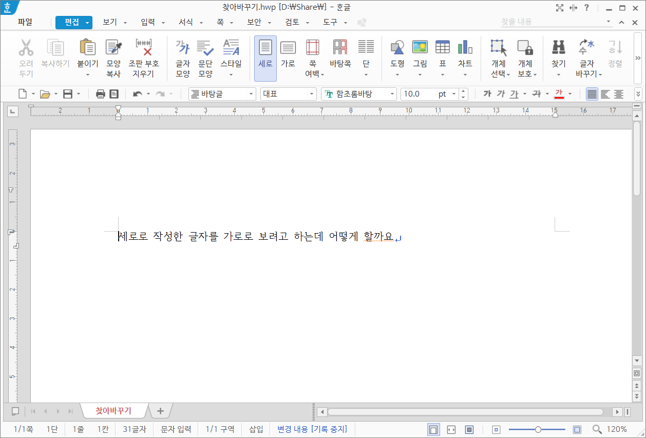 세로로 작성한 글자를 가로로 보려고 하는데 어떻게 할까요
