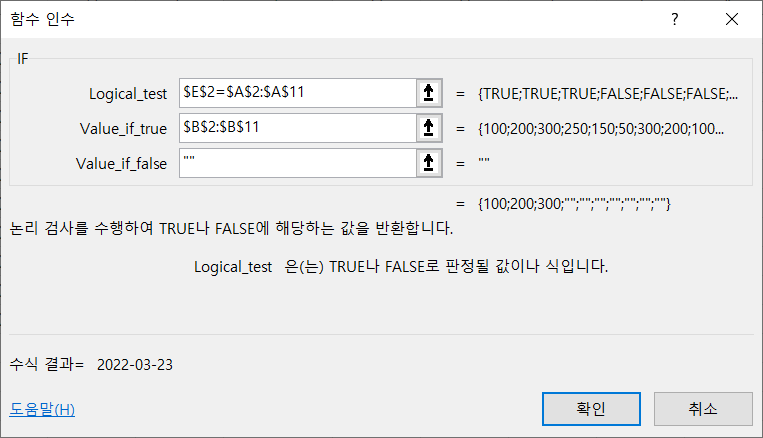 그래서 IF 함수의 결과는 배열 {100, 200, 300, "", "", "", "", "", "", ""} 이 됩니다.