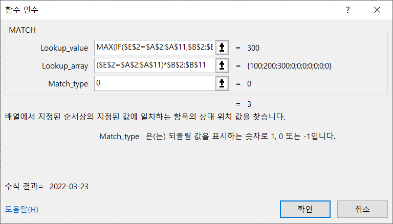 MATCH 함수의 결과는 300이 목록 중 몇 번째에 있는지 찾습니다. 3번째에 있는 것으로 구했습니다.