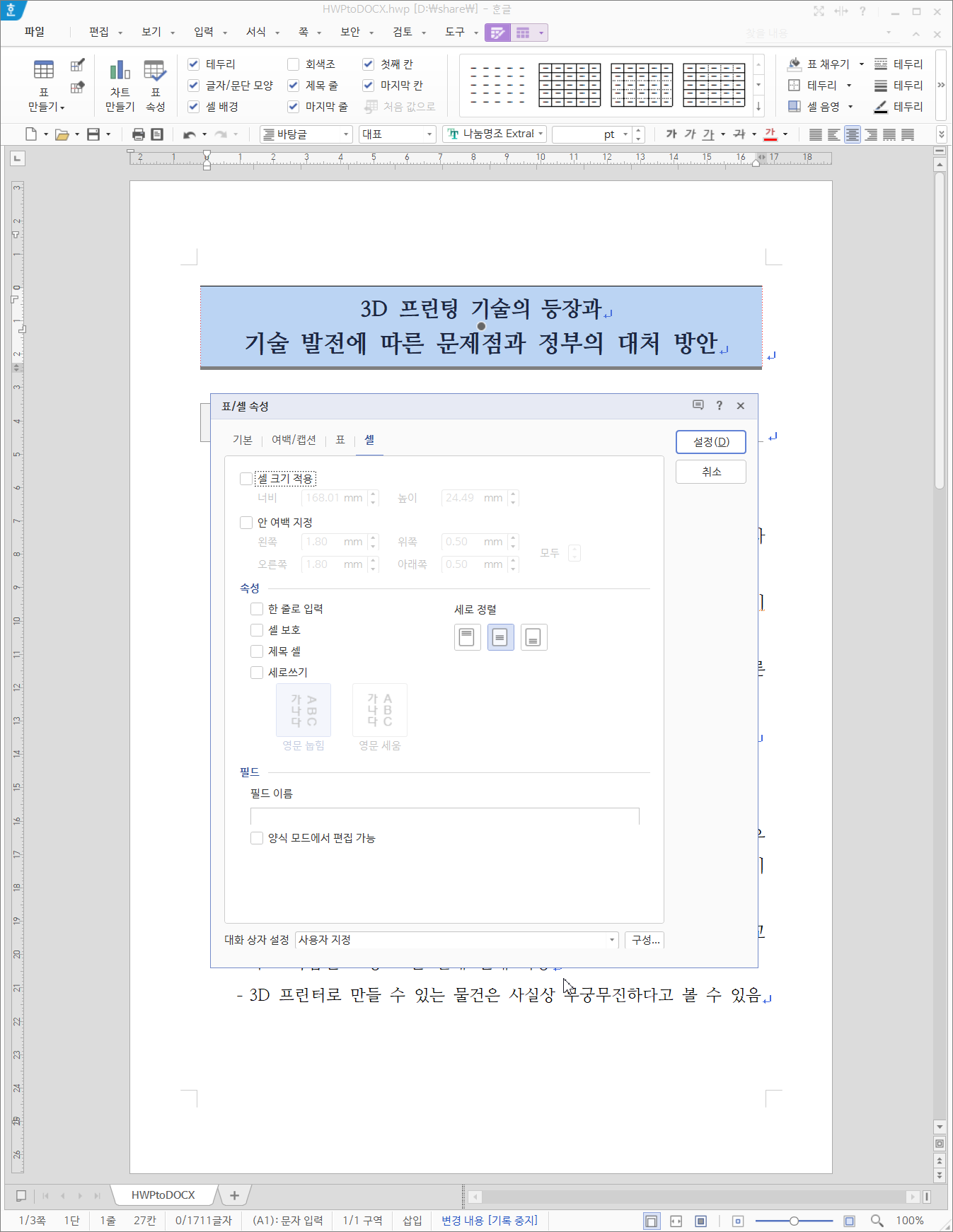 한글에서 제목을 나타내는 표에 커서를 두고 <F5> 셀 선택한 뒤 <P> [표/셀 속성]을 나타내고 [셀] 탭을 선택합니다.