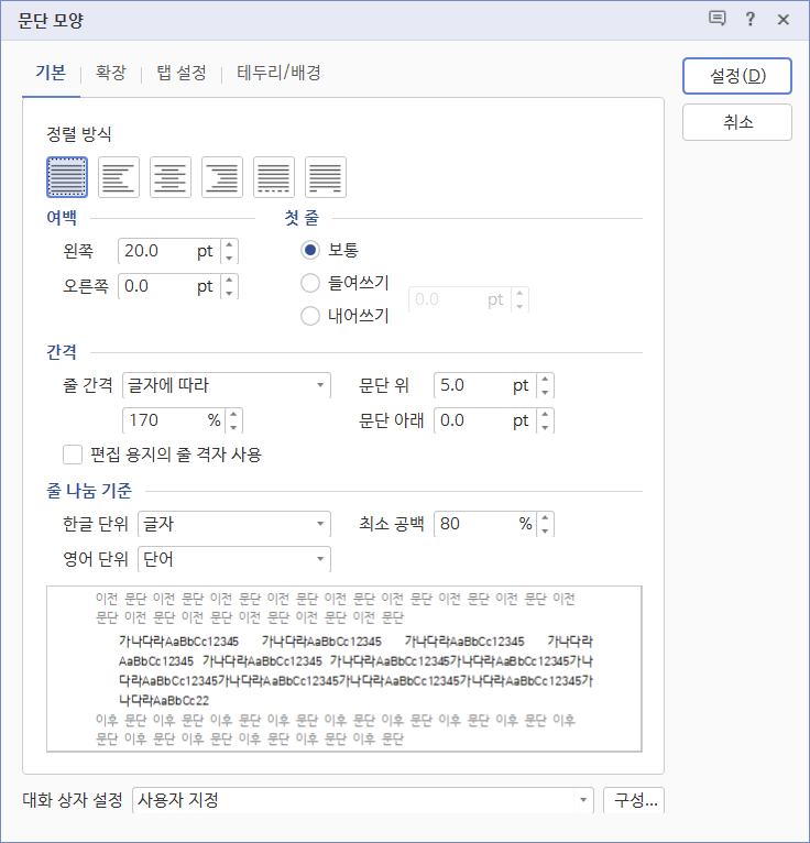 워드에서 같은 위치에서 [단락] 대화상자를 나타냅니다.