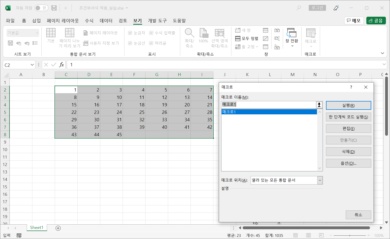 [C2:I8] 셀 범위를 선택하고 [보기]-[매크로]-[매크로 보기]를 선택합니다.