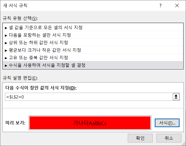 '수식'을 선택해서 [L2] 셀 값이 0인 경우에 빨강으로 지정하는 조건부 서식을 작성합니다.