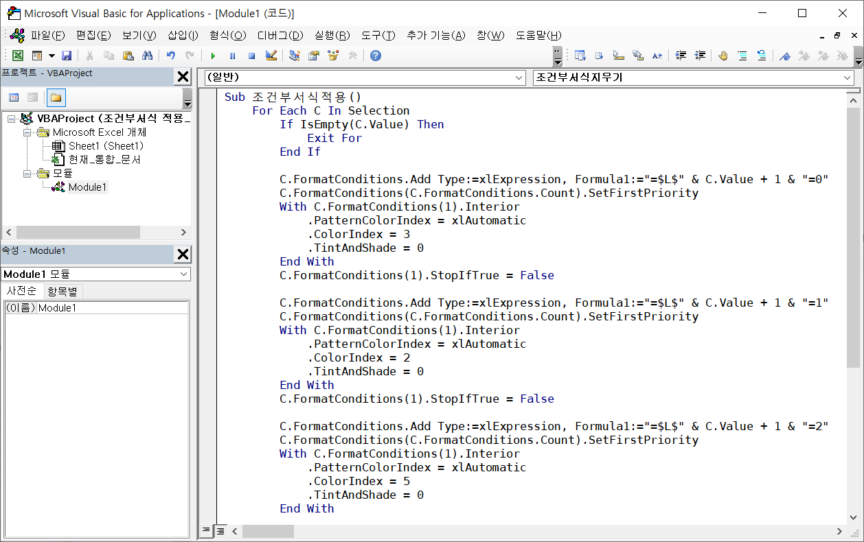 시트 전체의 설정된 조건부 서식을 지우는 매크로도 하나 만듭니다.