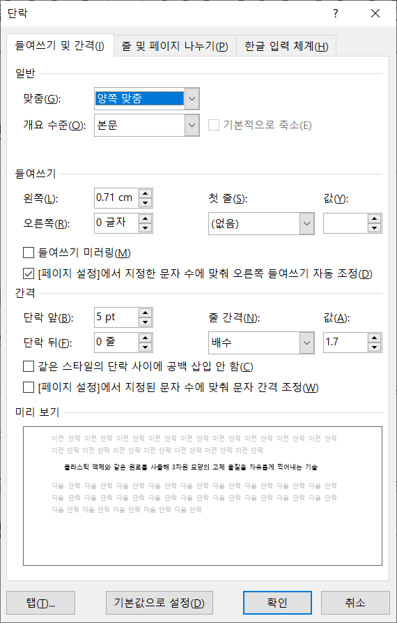 문단 앞 간격이나 줄 간격, 들여쓰기 등이 같은 값으로 설정되어 있지만 나타나는 모습은 다릅니다.