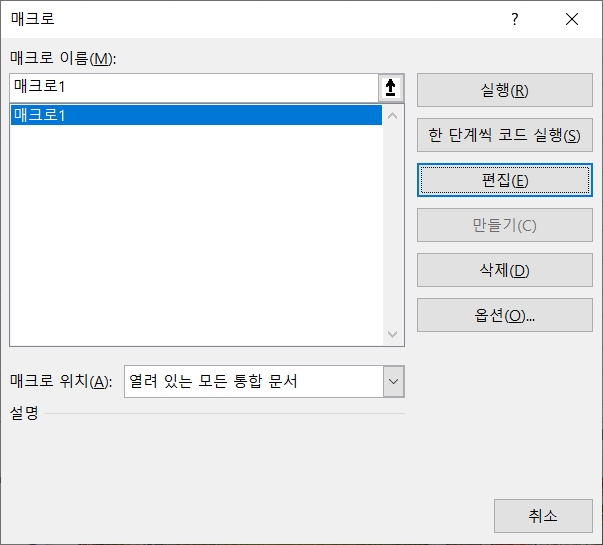 '매크로1'을 선택한 뒤 [편집]을 클릭합니다.