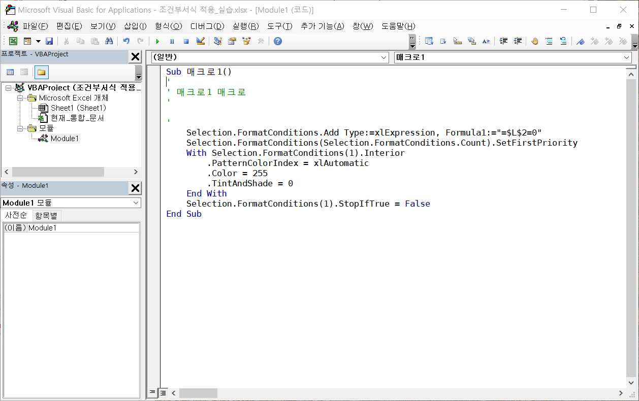 VBE가 실행되고 만들어진 매크로 코드가 보입니다.