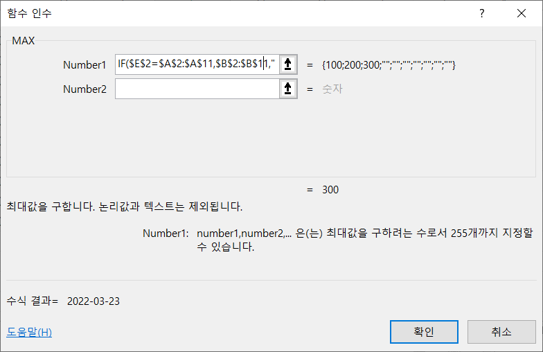 MAX 함수는 IF 함수의 결과 중 가장 큰 값인 300을 구합니다.