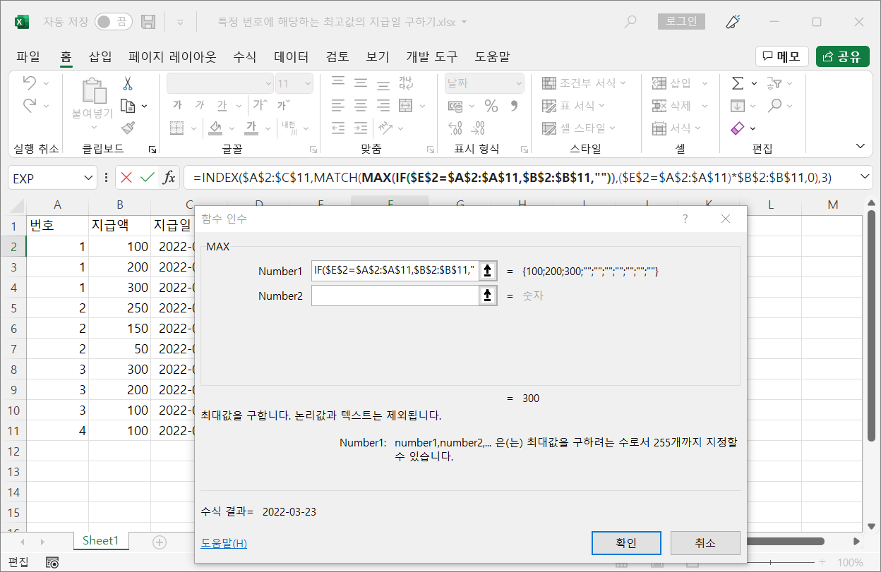 2022.03.21 - 번호가 여러 번 입력되어 있고 지급액이 각각 다른 경우 특정 번호에 해당하는 최고값 구하기