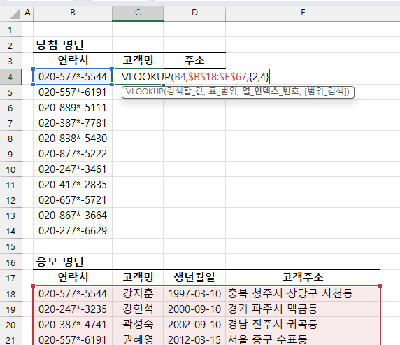 고객명을 찾아올 셀을 선택하고 =VLOOKUP 함수를 입력한 후 검색할 값으로 당첨 명단에서 연락처 셀을 지정합니다.