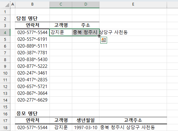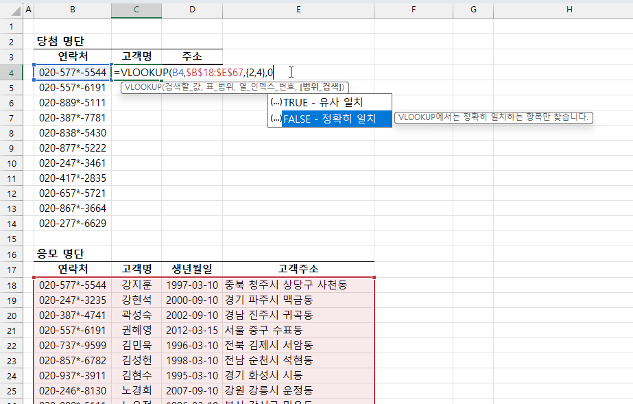 VLOOKUP 함수를 사용해 응모 명단에서 고객명과 주소를 찾아오는 수식을 각각 작성했다면 이제 이 방법을 사용해 보세요.