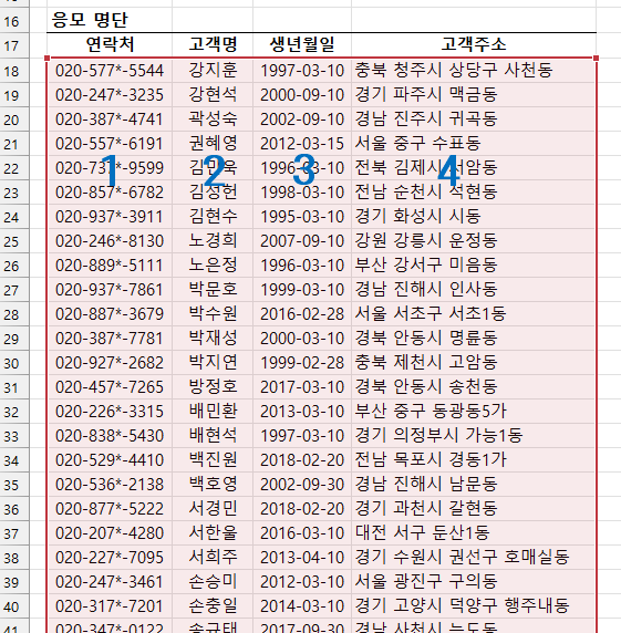 이제 찾아올 값이 있는 열 인덱스 번호를 지정해야 합니다. 검색할 표 범위에서 연락처는 1, 고객명은 2, 생년월일은 3, 고객주소는 4로 열 인덱스 번호가 됩니다.