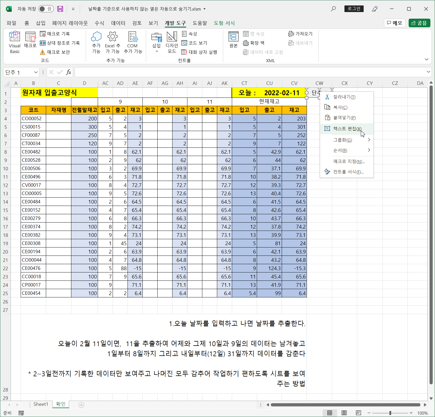 [CU1] 셀에 TODAY 함수로 오늘 날짜가 자동으로 나오도록 되어 있었는데, 설명을 위해 '2022-02-11'로 직접 입력했고, CT, CU 열 수식을 SUMIF 함수로 바꿨습니다.
