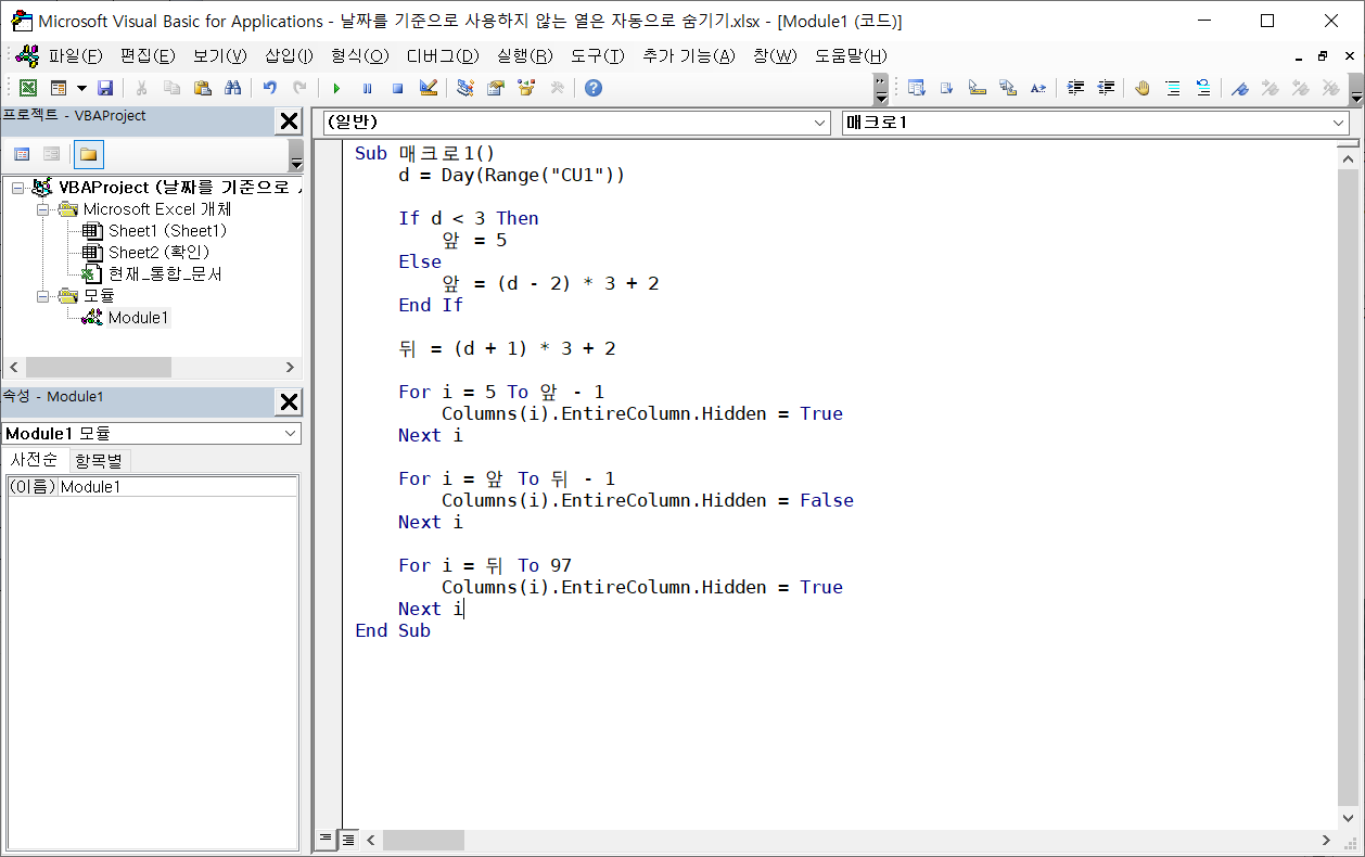 다음 달은 현재 시트를 복사해서 쓰려고 하는데, 현재 코드가 작성된 곳은 모듈(Module)입니다.